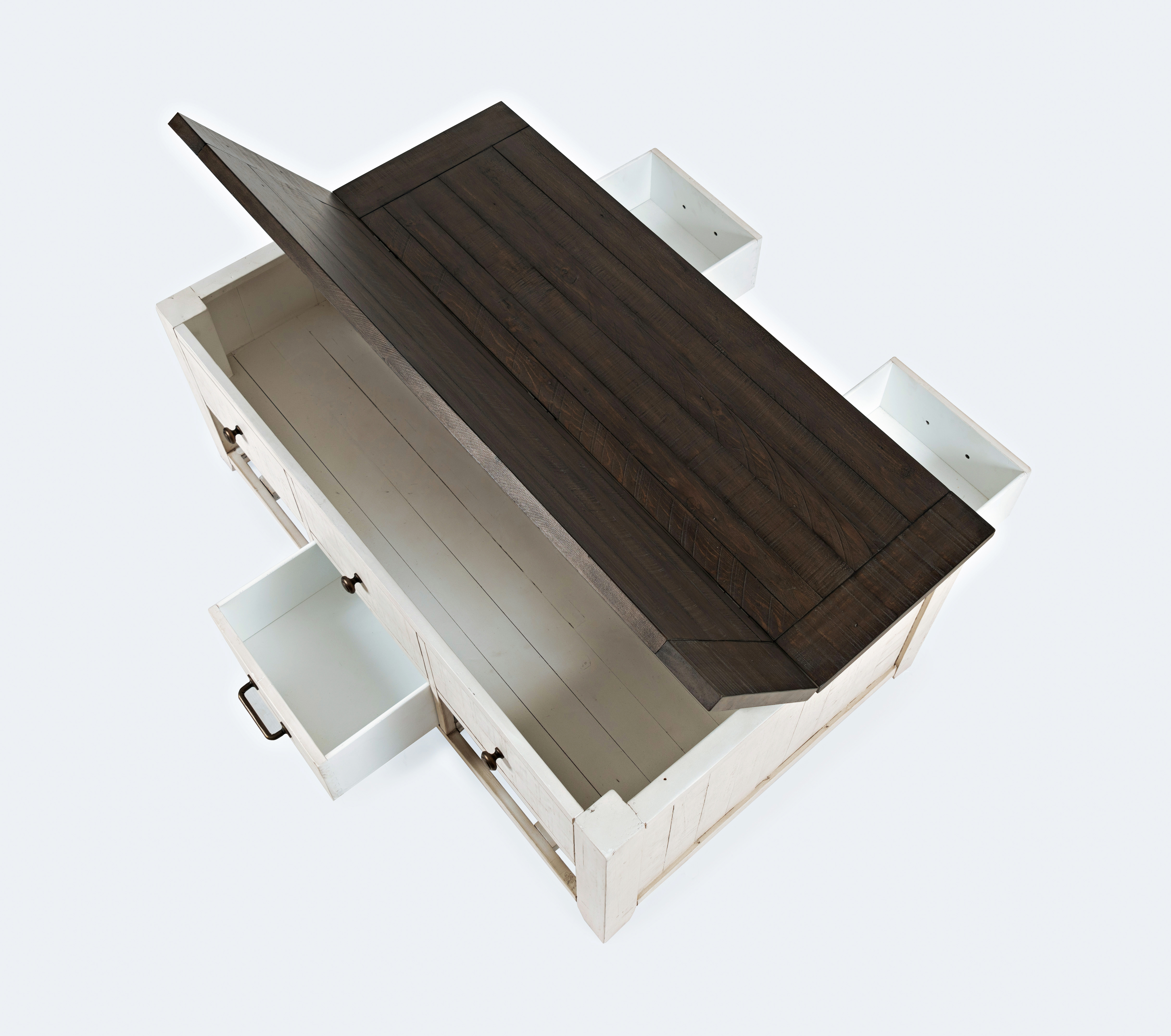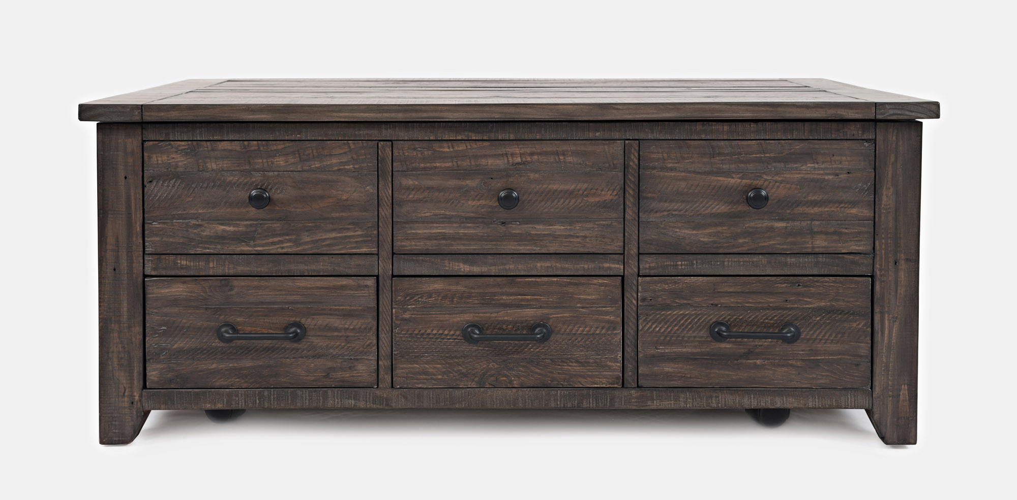 Bring versatile function and rustic farmhouse style to your living room with this 48-inch lift-top coffee table crafted from solid reclaimed pine. Natural weathering, character marks, and subtle finish variations showcase the unique history of the wood, while the lift-top surface reveals a generous hidden compartment for everyday essentials. Three additional drawers keep clutter neatly tucked away, and optional casters provide mobility for entertaining or rearranging your space. Designed for comfort, utility, and timeless style.